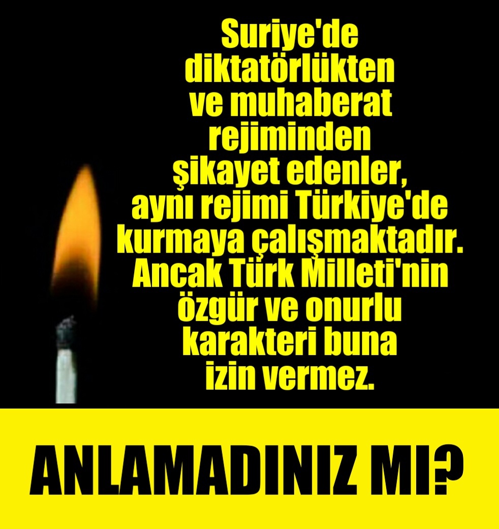 Suriye’de diktatörlükten ve muhaberat rejiminden şikayet edenler, aynı rejimi Türkiye’de kurmaya çalışmaktadır. Ancak Türk Milleti’nin özgür ve onurlu karakteri buna izin vermez.