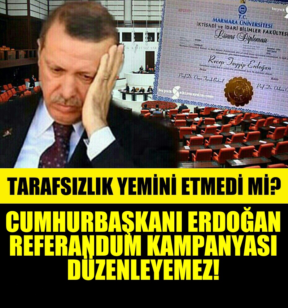 Gelelim Cumhurbaşkanı Erdoğan’ın referandum kampanyası düzenleyip, düzenleyemeyeceği konusuna, Büyük Türk Milleti huzurunda TBMM’de şerefi ve namusu üzerine tarafsızlık yemini etmiş olduğu için referandum kampanyası düzenleyemez.