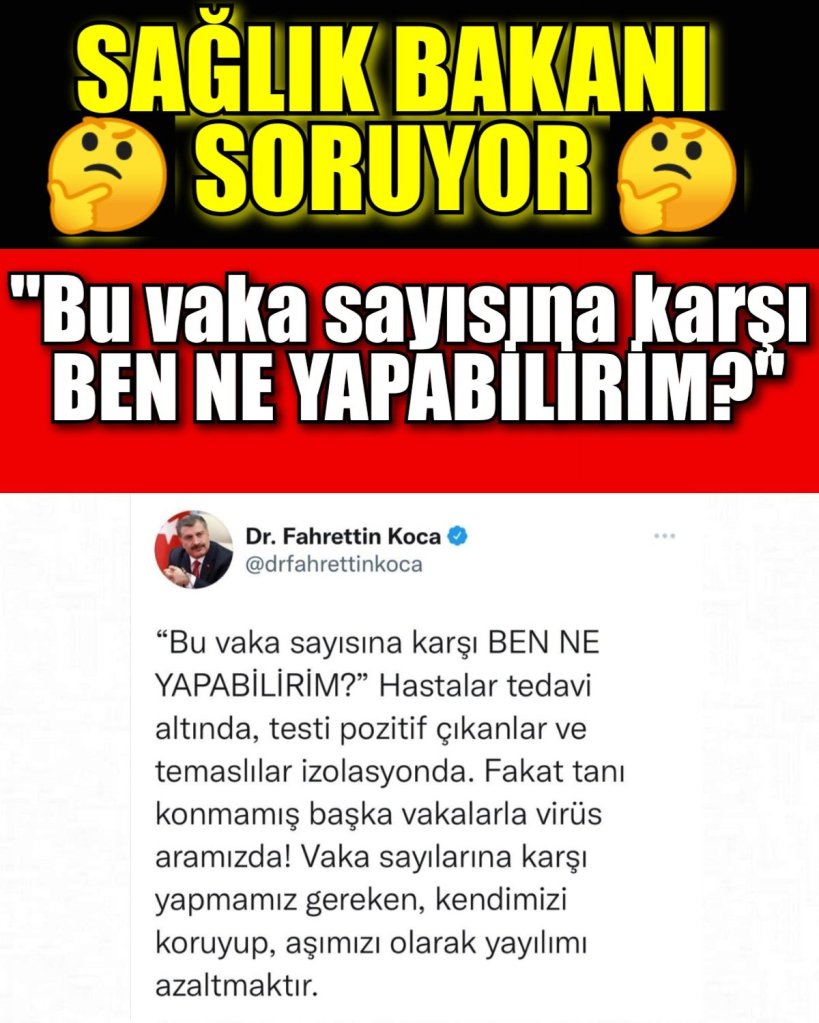 Sayın Koca’nın “elimden gelen her şeyi yapıyorum ama bir türlü vaka sayısı aşağıya inmiyor. Vaka sayısıyla birlikte ölümlere de engel olamıyoruz” demek istediğini düşünüyoruz ve ona göre sayın bakanın paylaşımını yorumluyoruz.
