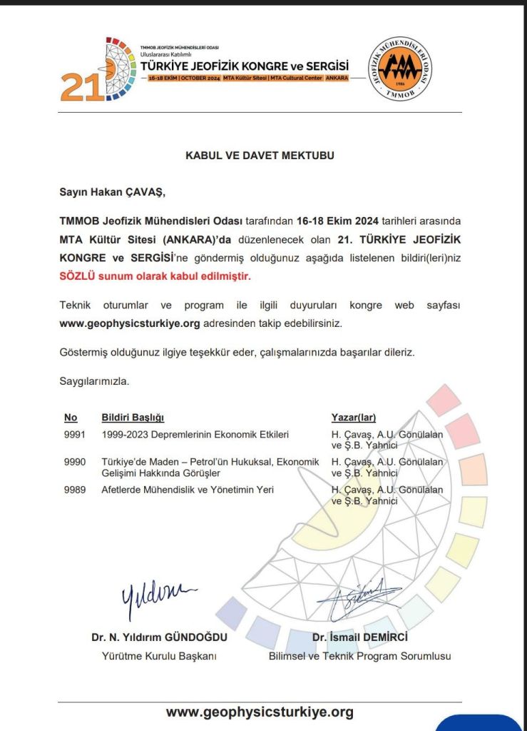 Bu kongre ve sergide benim de içinde bulunduğum bir ekiple hazırlamış bulunduğumuz “AFETLERDE MÜHENDİSLİK VE YÖNETİMİN YERİ” başlıklı geniş bir inceleme ve rapor Jeofizik Mühendisleri Odası’nca kabul görmüş ve SÖZLÜ SUNUM için tarafımıza davet gönderilmiştir.