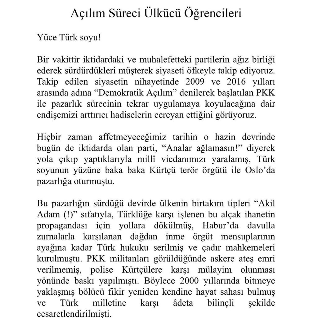 Şimdi sizlerle bir bildiri paylaşacağım. Bizim 12 Mart evvelinden gelen 12 Eylüle uzanan, 12 Eylül’ün acı, çile, ızdırap dolu günlerini yaşayan ( o günleri üleşen/bölüşen) arkadaşlarımızdan hemen sonra gelen ve hareketin daha yakın tarihine uzanan bir çizgi üzerinde duran ve çilenin, acının, yürek yarasının son örneklerini yaşamış bir nesil var. İşte acıyı tadan, çileyi çeken, yüreği yanan, şehit arkadaş cenazesi omuzlayan son nesil mensuplarının bir bildirisini sizlerle paylaşmak istiyorum. “Açılım sürecinin ülkücü öğrencileri” bakın ne diyorlar…