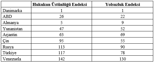 Danimarka her iki endekste de birinci sırada. Bu anlamda hukukun üstünlüğü ve yolsuzluk yokluğu açısından dünyanın en temiz ülkesi olarak ortaya çıkıyor. Tabloda yer almayan diğer kuzey ülkeleri de hemen Danimarka’nın arkasında yer alıyor. Tabloda dikkati çeken üç ülke var: Arjantin, Çin ve Rusya. Üçü de hukukun üstünlüğü açısından Türkiye’den iyi durumda. Sadece Rusya yolsuzluk yokluğu endeksinde bizden kötü durumda bulunuyor.