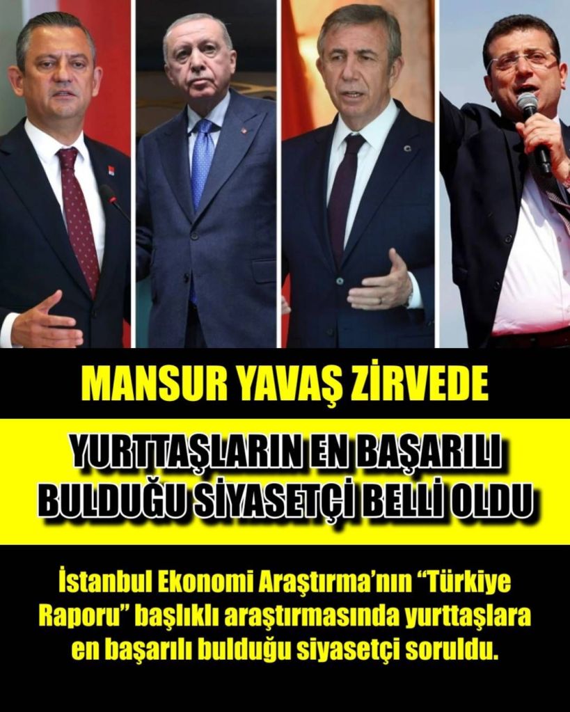 İstanbul Ekonomi Araştırma’nın “Türkiye Raporu” başlıklı araştırmasında yurttaşlara en başarılı bulduğu siyasetçi soruldu. Anket sonuçlarına göre, AKP Genel Başkanı ve Cumhurbaşkanı Recep Tayyip Erdoğan ile CHP lideri Özgür Özel arasındaki fark açıldı.