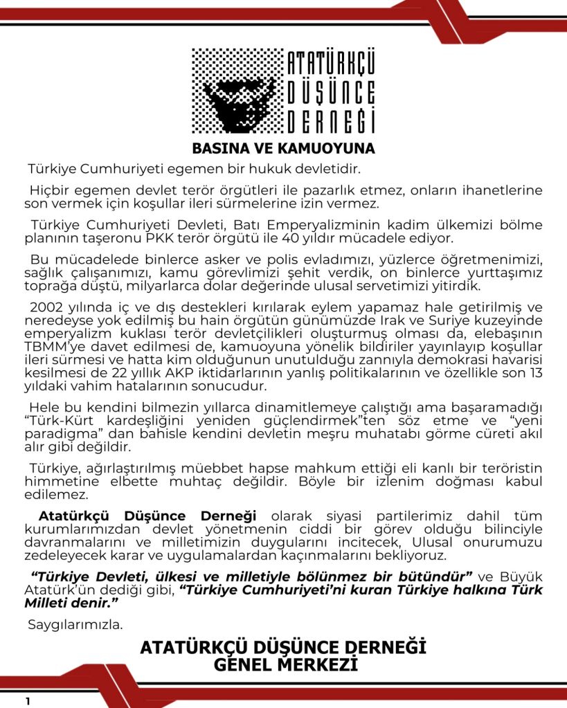 Atatürkçü Düşünce Derneği, yaptığı yazılı açıklamada, Türkiye Cumhuriyeti’nin terör örgütleriyle müzakere yapamayacağını ve onların taleplerine boyun eğemeyeceğini vurguladı. Dernek, son dönemdeki gelişmelere dikkat çekerek, PKK terör örgütünün yıllardır süren mücadelede binlerce hayat kaybına ve büyük ekonomik kayıplara neden olduğunu belirtti.