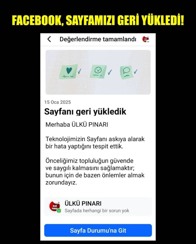 İtirazımız neticesinde, hatalı bir işlem yapıldığını kabul ettiler ve ÜLKÜ PINARI sayfamızı geri yüklediler.