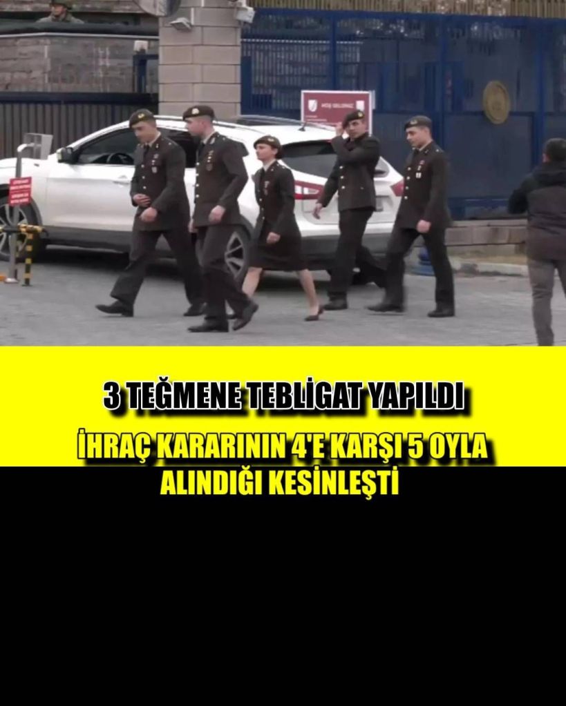 TSK’dan ihraç edilen 3 teğmene şifai tebligat yapılırken, kararın 4’e karşı 5 oyla alındığı kesinleşti. Gazeteci ve 12punto yazarı Müyesser Yıldız’ın haberine göre ihraç kararına karşı çıkanlar arasında YDK Başkanı ve KKK Kurmay Başkanı da bulunuyor.