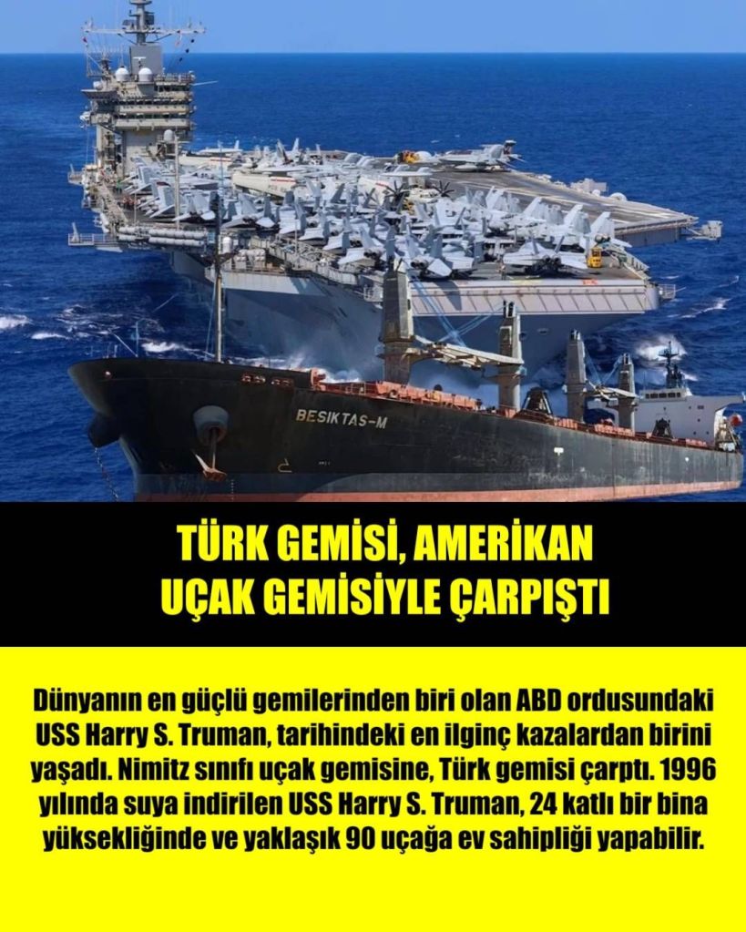 Dünyanın en güçlü gemilerinden biri olan ABD ordusundaki USS Harry S. Truman, tarihindeki en ilginç kazalardan birini yaşadı. Nimitz sınıfı uçak gemisine, Türk gemisi çarptı. 1996 yılında suya indirilen USS Harry S. Truman, 24 katlı bir bina yüksekliğinde ve yaklaşık 90 uçağa ev sahipliği yapabilir.