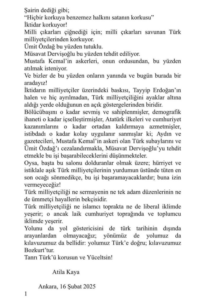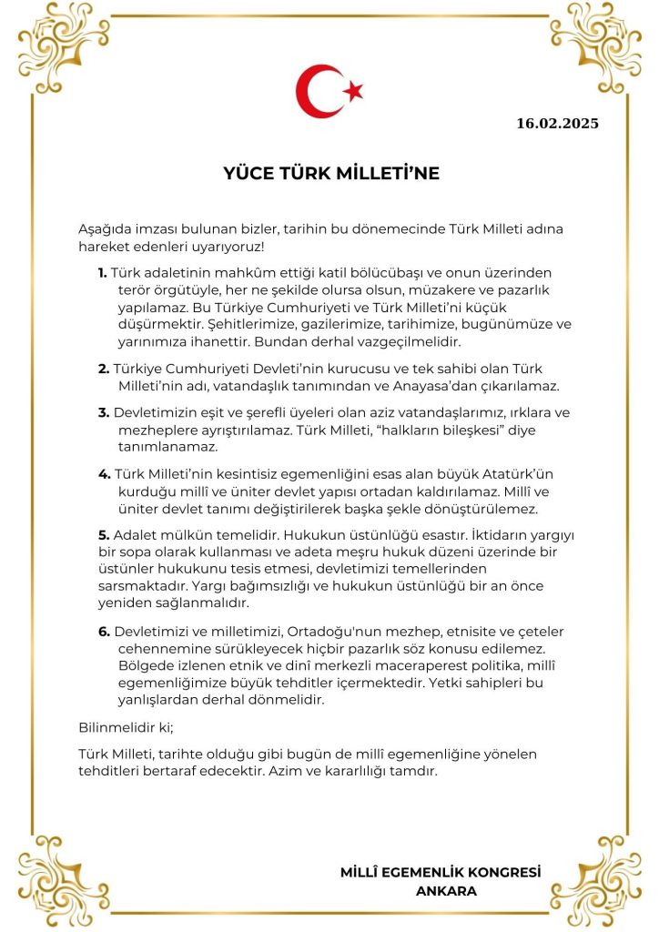 Milli Egemenlik Platformu öncülüğünde bir araya gelen kuruluşların Ankara’daki buluşması gerçekleşti. ABB Başkanı Mansur Yavaş’ın, Zafer Partisi Genel Başkan Vekili Prof. Ali Şehirlioğlu’nun ve İYİ Parti Genel Başkanı Müsavat Dervişoğlu’nun bir araya gelerek önemli mesajlar veren konuşmalar yaptıkları toplantı Prof. Ahmet Bican Ercilasun’un başkanlığında gerçekleşti. Platform kongre bildirisini Bican Hoca okudu. Bildiri metni aşağıdadır.