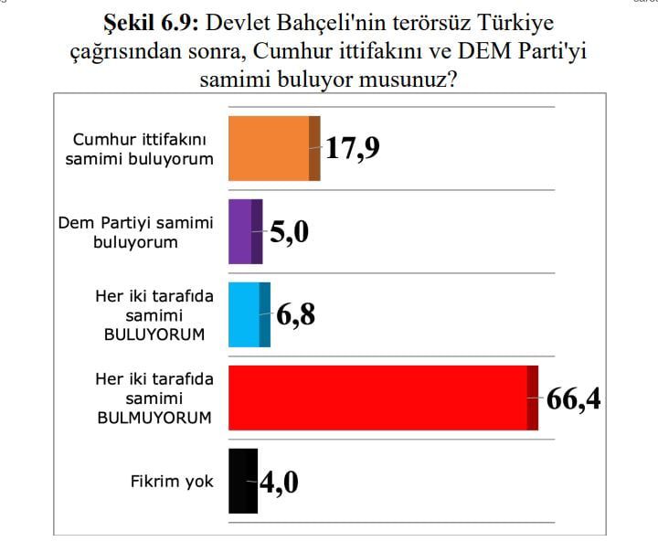 Bu arada, Saros Araştırma, vatandaşlara “Devlet Bahçeli’nin terörsüz Türkiye çağrısından sonra, Cumhur ittifakı’nı ve DEM Parti’yi samimi buluyor musunuz?” diye sordu. Vatandaşların yüzde 66,4’ü “Her iki tarafı da samimi bulmuyorum” dedi.