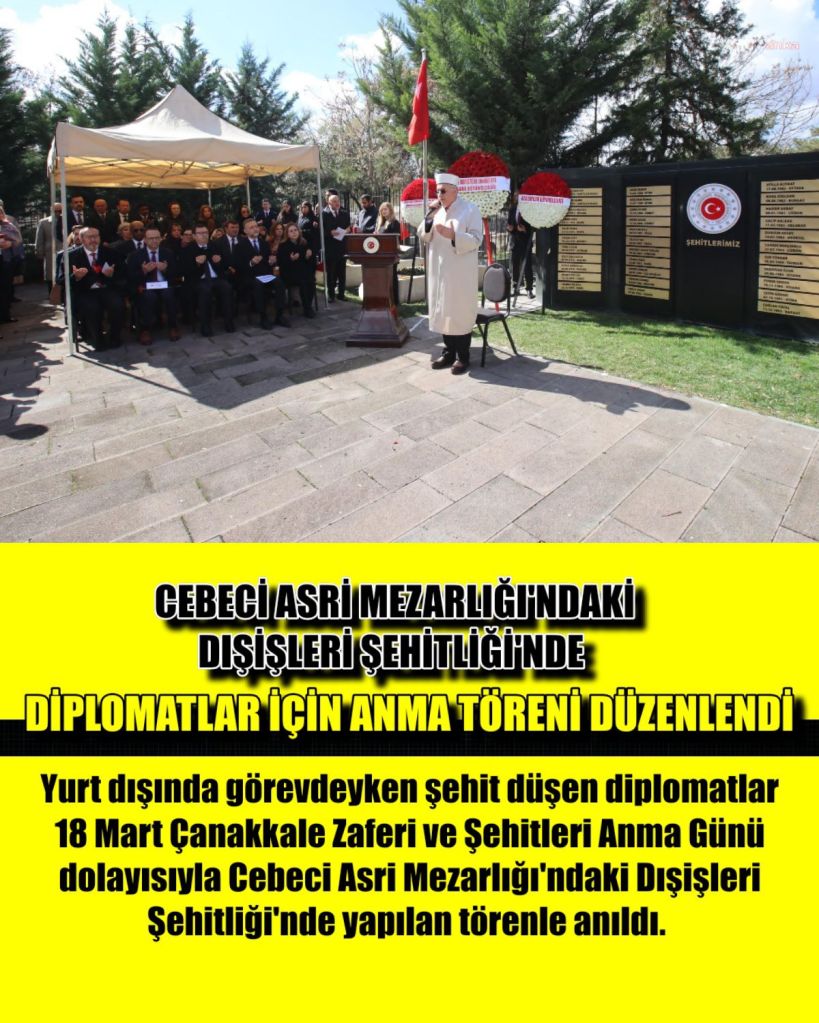 Yurt dışında görevdeyken terör saldırıları sonucu şehit düşen diplomatlar ve yakınları, 18 Mart Çanakkale Zaferi ve Şehitleri Anma Günü dolayısıyla Cebeci Asri Mezarlığı’ndaki Dışişleri Şehitliği’nde yapılan törenle anıldı. Törene, Bakanlık mensupları, şehit yakınları ve yabancı misyon temsilcileri katıldı. Saygı duruşuyla başlayan törende konuşan Dışişleri Bakan Yardımcısı Büyükelçi Gümrükçü, yurt dışında Türkiye’yi büyük bir özveri ve şerefle temsil ederken şehit edilen diplomatlar ile aile fertlerinin manevi huzurunda tüm şehitleri anmak üzere bir araya geldiklerini belirtti. Bugünün aynı zamanda Çanakkale Deniz Zaferi’nin 110’ununcu yıl dönümü olduğu kaydeden Gümrükçü, canlarını feda eden tüm vatandaşları andı.