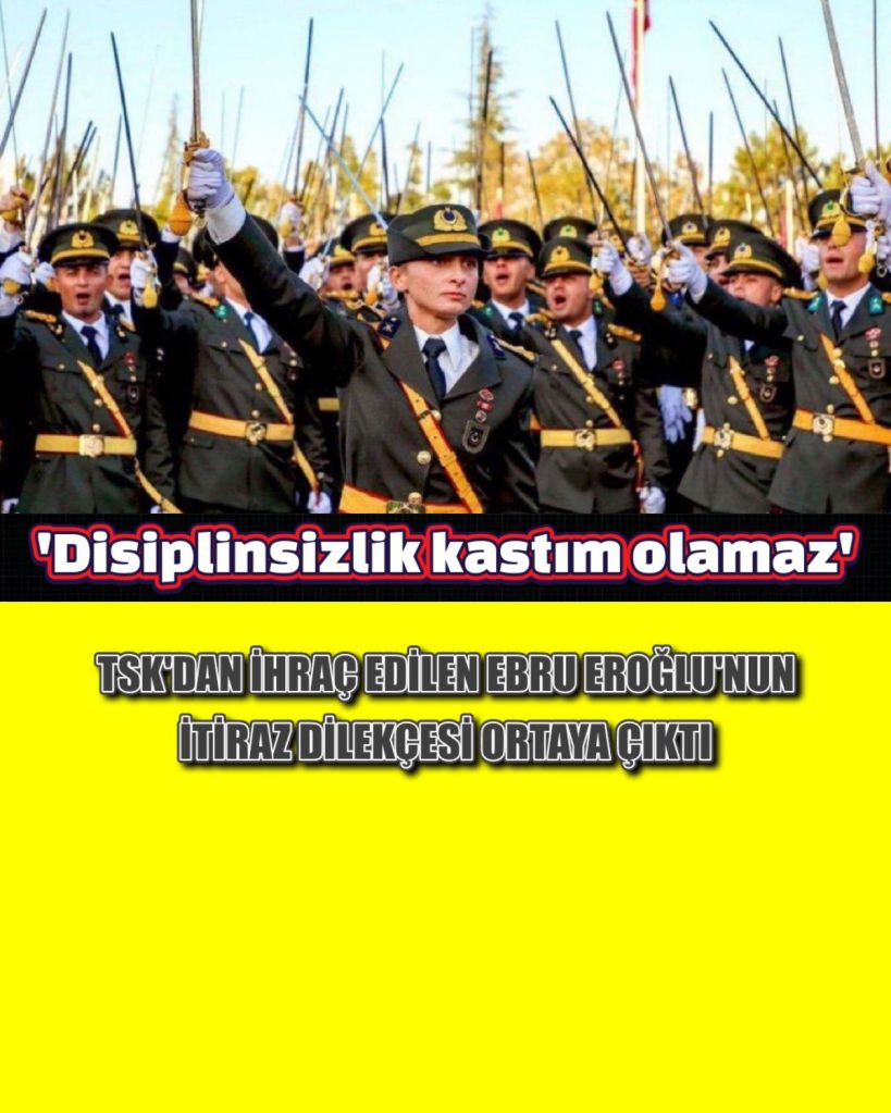 Türk Silahlı Kuvvetleri’nden (TSK) ihraç edilen Teğmen Ebru Eroğlu’nun itiraz dilekçesi ortaya çıktı. Eroğlu’nun dilekçesinde “Devletime yakışır bir Harbiyeliyim. Disiplinsizlik yapmam!” dediği öğrenildi.