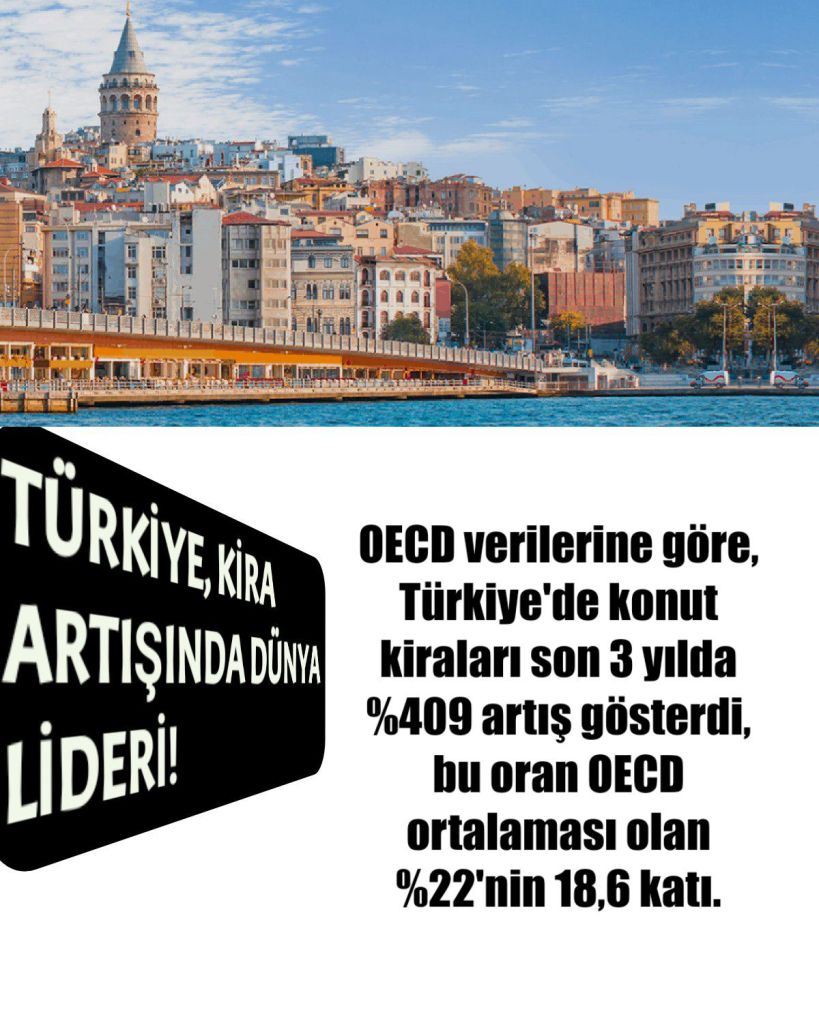 OECD verilerine göre, Türkiye’de konut kiraları son 3 yılda %409 artış gösterdi, bu oran OECD ortalaması olan %22’nin 18,6 katı.