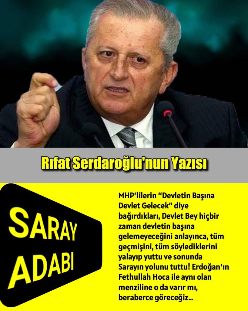 MHP’lilerin “Devletin Başına Devlet Gelecek” diye bağırdıkları, Devlet Bey hiçbir zaman devletin başına gelemeyeceğini anlayınca, tüm geçmişini, tüm söylediklerini yalayıp yuttu ve sonunda Sarayın yolunu tuttu! Erdoğan’ın Fethullah Hoca ile aynı olan menziline o da varır mı, beraberce göreceğiz…