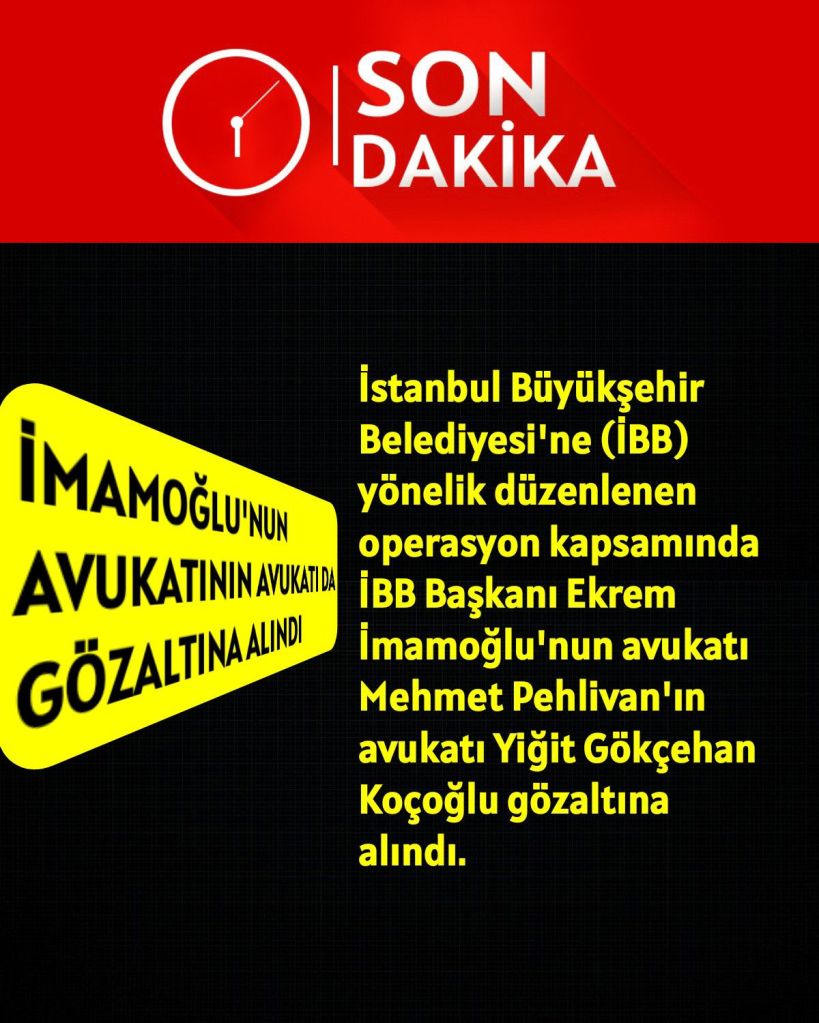 Son dakika haberi… İstanbul Büyükşehir Belediyesi’ne (İBB) yönelik düzenlenen operasyon kapsamında İBB Başkanı Ekrem İmamoğlu’nun avukatı Mehmet Pehlivan’ın avukatı Yiğit Gökçehan Koçoğlu gözaltına alındı.