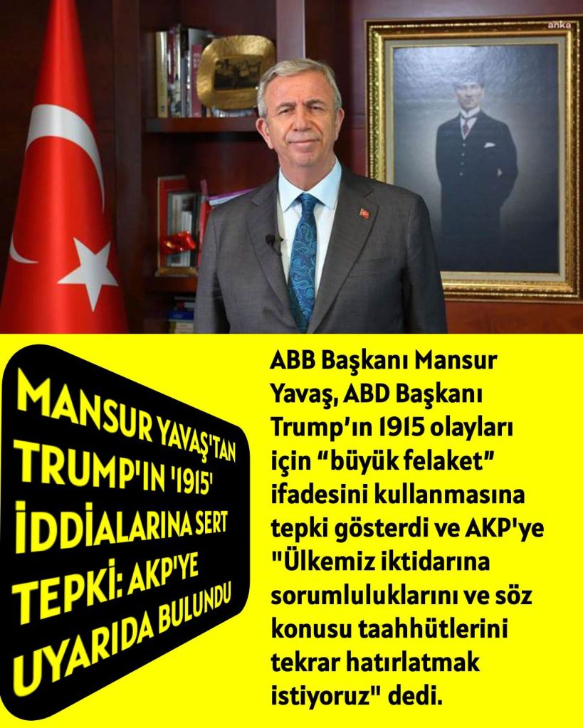ABB Başkanı Mansur Yavaş, ABD Başkanı Trump’ın 1915 olayları için “büyük felaket” ifadesini kullanmasına tepki gösterdi ve AKP’ye “Ülkemiz iktidarına sorumluluklarını ve söz konusu taahhütlerini tekrar hatırlatmak istiyoruz” dedi.