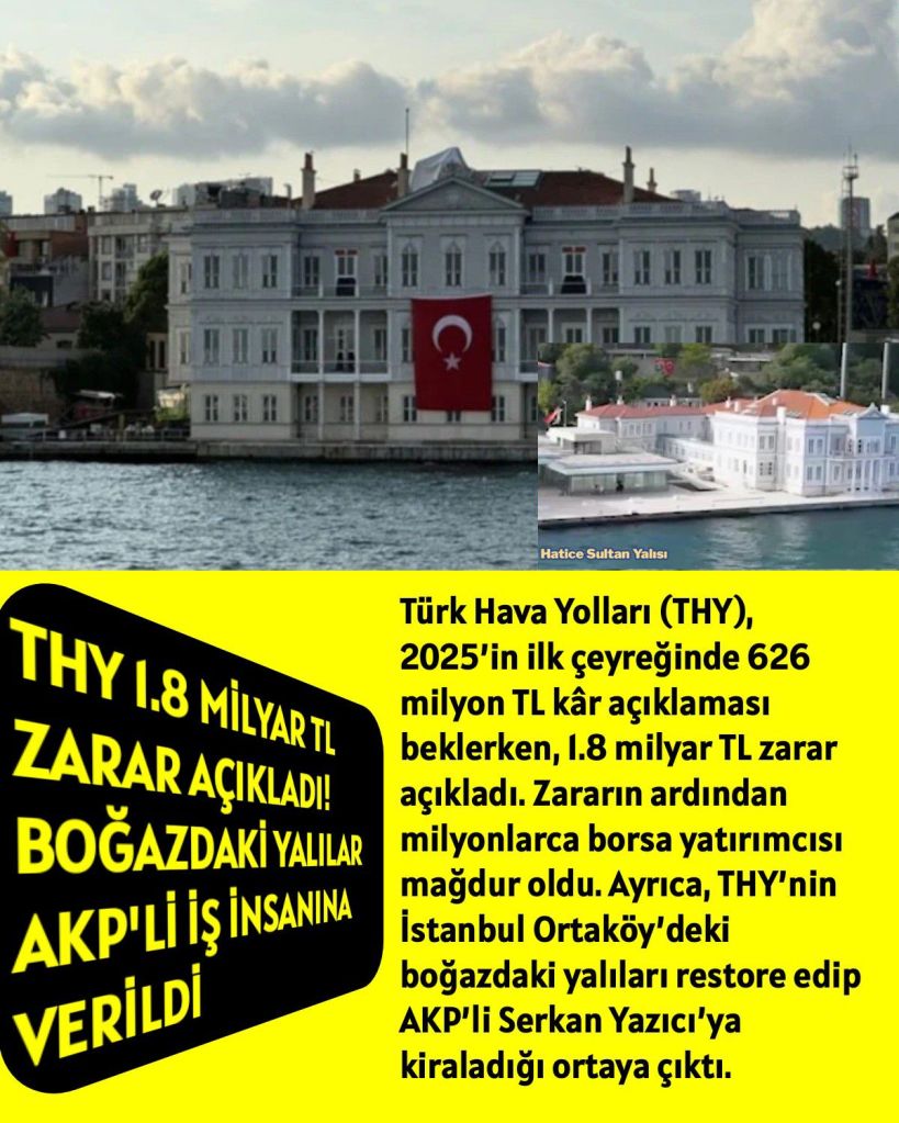 Türk Hava Yolları (THY), 2025’in ilk çeyreğinde 626 milyon TL kâr açıklaması beklerken, 1.8 milyar TL zarar açıkladı. Zararın ardından milyonlarca borsa yatırımcısı mağdur oldu. Ayrıca, THY’nin İstanbul Ortaköy’deki boğazdaki yalıları restore edip AKP’li Serkan Yazıcı’ya kiraladığı ortaya çıktı.