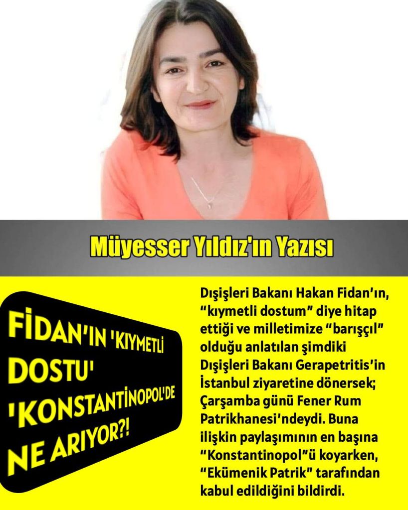 Dışişleri Bakanı Hakan Fidan’ın, “kıymetli dostum” diye hitap ettiği ve milletimize “barışçıl” olduğu anlatılan şimdiki Dışişleri Bakanı Gerapetritis’in İstanbul ziyaretine dönersek; Çarşamba günü Fener Rum Patrikhanesi’ndeydi. Buna ilişkin paylaşımının en başına “Konstantinopol”ü koyarken, “Ekümenik Patrik” tarafından kabul edildiğini bildirdi.
