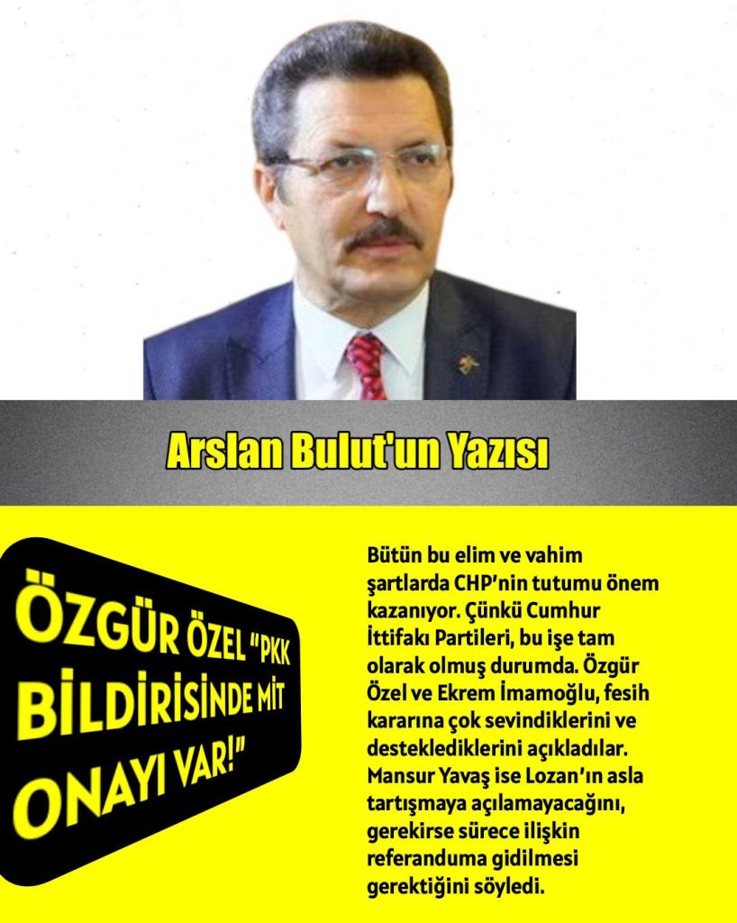 Özel, “Biz tapu senedi kabul ediyoruz Lozan’ı. 45 yıl boyunca Türkiye Cumhuriyeti’nin karşısında terör eylemleri yapmış olan, askerini hedef almış olan, anayasal düzenini hedef almış olan bir terör örgütünün bildirisine muhatap olarak ben kendimi kılacak değilim. Türkiye Cumhuriyeti’nin kurucu partisi, bir terör örgütünün bildirisini kendisine muhatap kabul etmez. Bu bildirinin iki tane muhatabı var. Sayın Bahçeli, Sayın Erdoğan. O bildiri MİT’in onayı olmaksızın açıklanabilecek bir bildiri değil. Cumadan itibaren, kongrenin bittiğinden itibaren kelimeleri müzakere ediyorlar. Neredeyse 2 yıllık bir geçmişi var.” dedi.