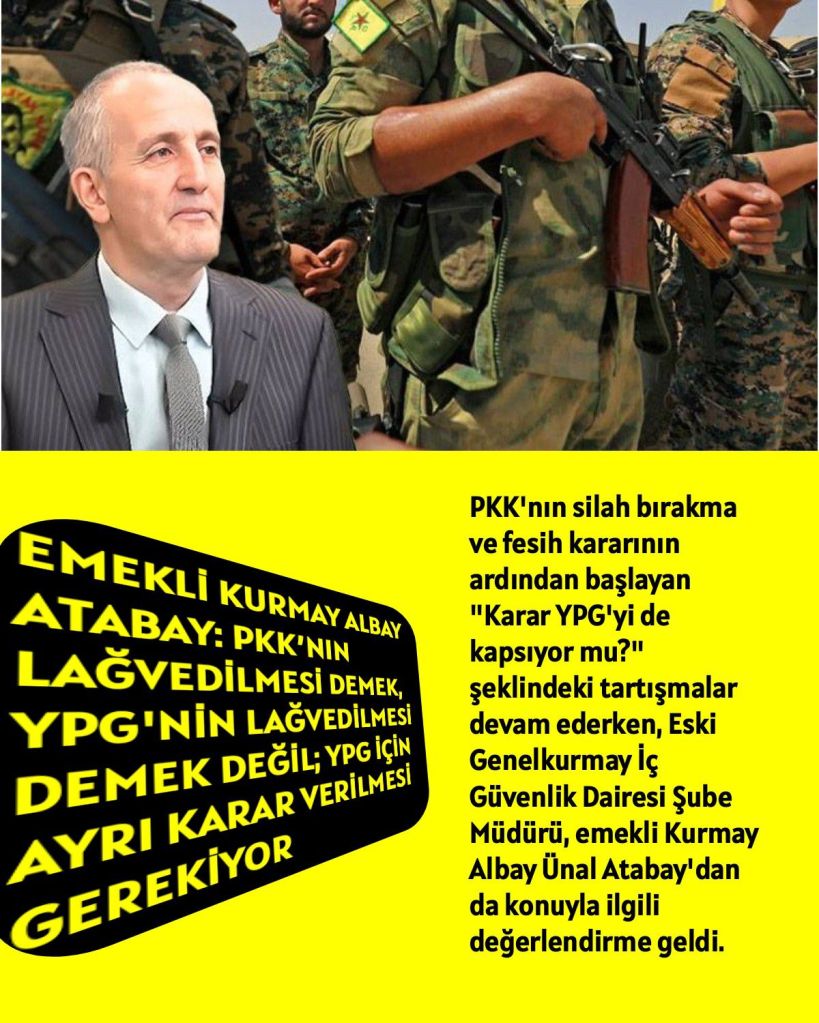 Genelkurmay Eski İç Güvenlik Dairesi Şube Müdürü, emekli Kurmay Albay Ünal Atabay, PKK’nın silah bırakma ve kendini fesih duyurusuna ilişkin olarak Nefes yazarı Aytunç Erkin’e yaptığı açıklamada, “PKK’nın lağvedilmesi demek, YPG’nin lağvedilmesi demek değil. YPG için ayrı karar verilmesi gerekiyor” dedi.
