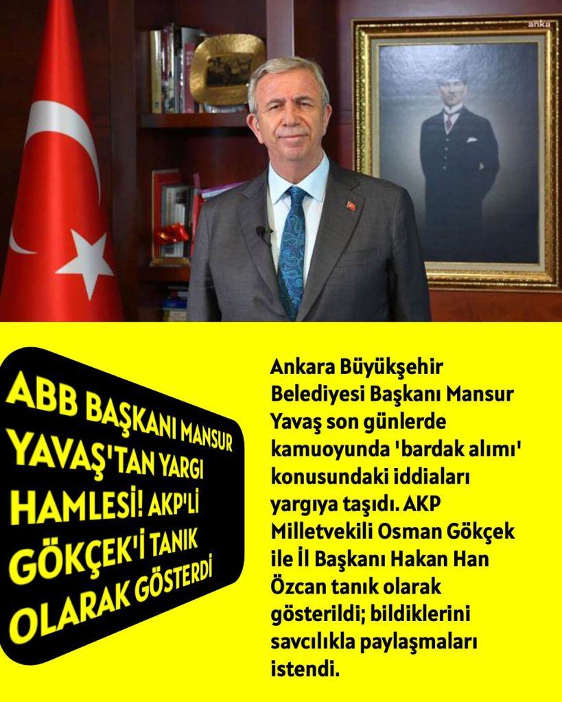 Ankara Büyükşehir Belediyesi Başkanı Mansur Yavaş son günlerde kamuoyunda ‘bardak alımı’ konusundaki iddiaları yargıya taşıdı. AKP Milletvekili Osman Gökçek ile İl Başkanı Hakan Han Özcan tanık olarak gösterildi; bildiklerini savcılıkla paylaşmaları istendi.