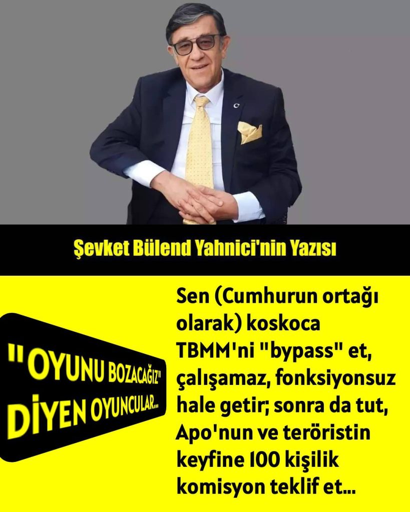 Sen (Cumhurun ortağı olarak) koskoca TBMM’ni “bypass” et, çalışamaz, fonksiyonsuz hale getir; sonra da tut, Apo’nun ve teröristin keyfine 100 kişilik komisyon teklif et…