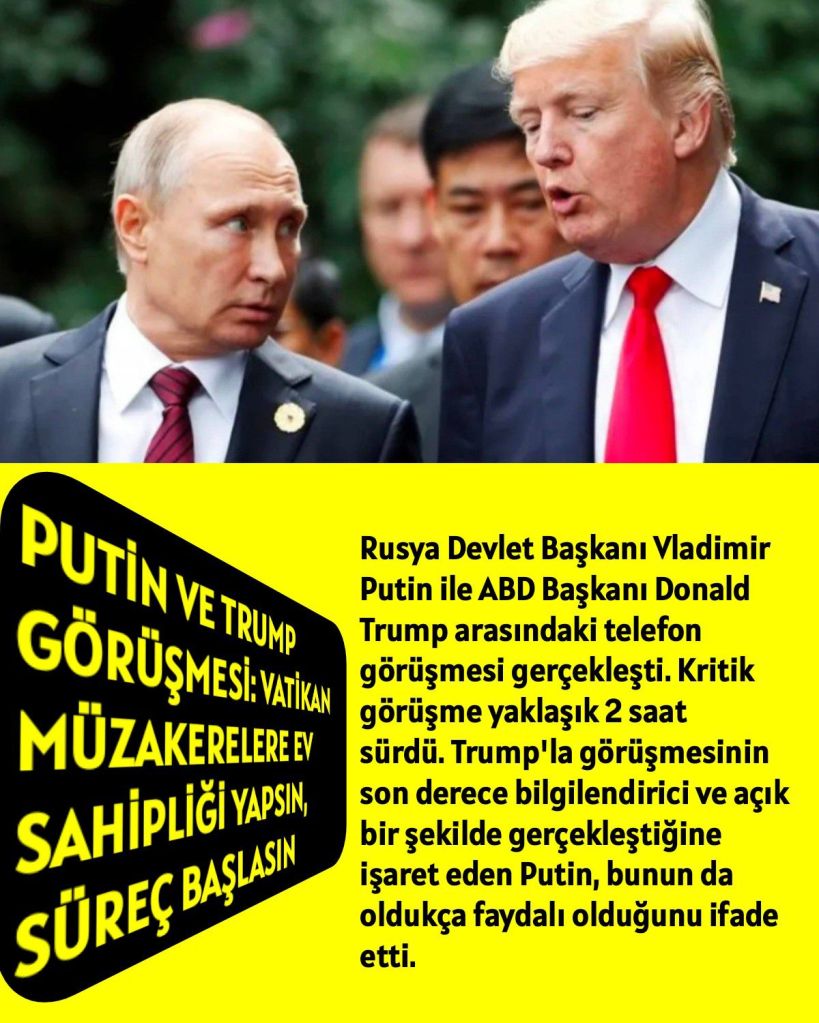 Rusya Devlet Başkanı Vladimir Putin, ABD Başkanı Donald Trump ile olan görüşmesinin ardından yaptığı açıklamada, görüşmenin yapıcı geçtiğini ve kıymetli bulduğunu söyledi. Putin, Ukrayna konusunda anlaşma için iki tarafın da tavizler vermesi gerektiğini belirtti. Putin, “Anlaşma sağlanırsa ateşkes mümkün” dedi. Trump da, “Rusya Devlet Başkanı Vladimir Putin ile iki saatlik görüşmeyi yeni tamamladım. Çok iyi geçtiğine inanıyorum. Rusya ve Ukrayna derhal ateşkes ve daha da önemlisi savaşın sonu için müzakerelere başlayacak” dedi. Avrupalı liderleri yaptığı görüşmenin hemen ardından bilgilendirdiğini belirten Trump, “Papa tarafından temsil edilen Vatikan, müzakerelere ev sahipliği yapmaya çok istekli olduğunu belirtti. Süreç başlasın!” dedi.