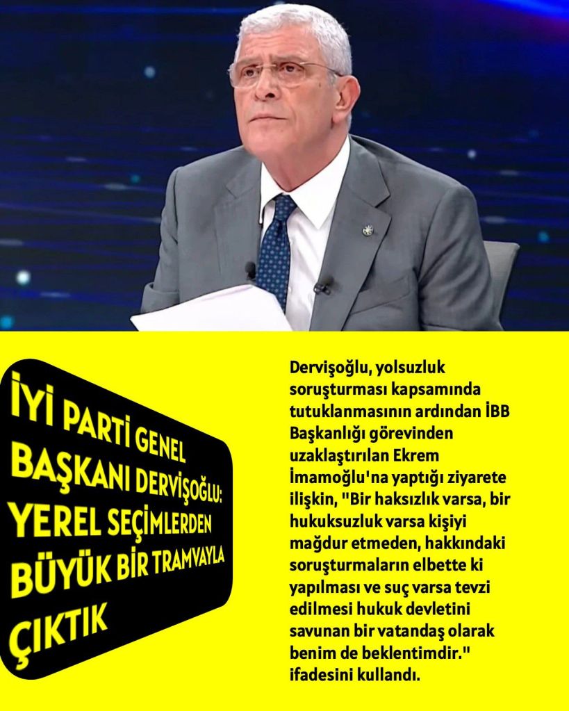 Dervişoğlu, yolsuzluk soruşturması kapsamında tutuklanmasının ardından İBB Başkanlığı görevinden uzaklaştırılan Ekrem İmamoğlu’na yaptığı ziyarete ilişkin, “Bir haksızlık varsa, bir hukuksuzluk varsa kişiyi mağdur etmeden, hakkındaki soruşturmaların elbette ki yapılması ve suç varsa tevzi edilmesi hukuk devletini savunan bir vatandaş olarak benim de beklentimdir.” ifadesini kullandı.