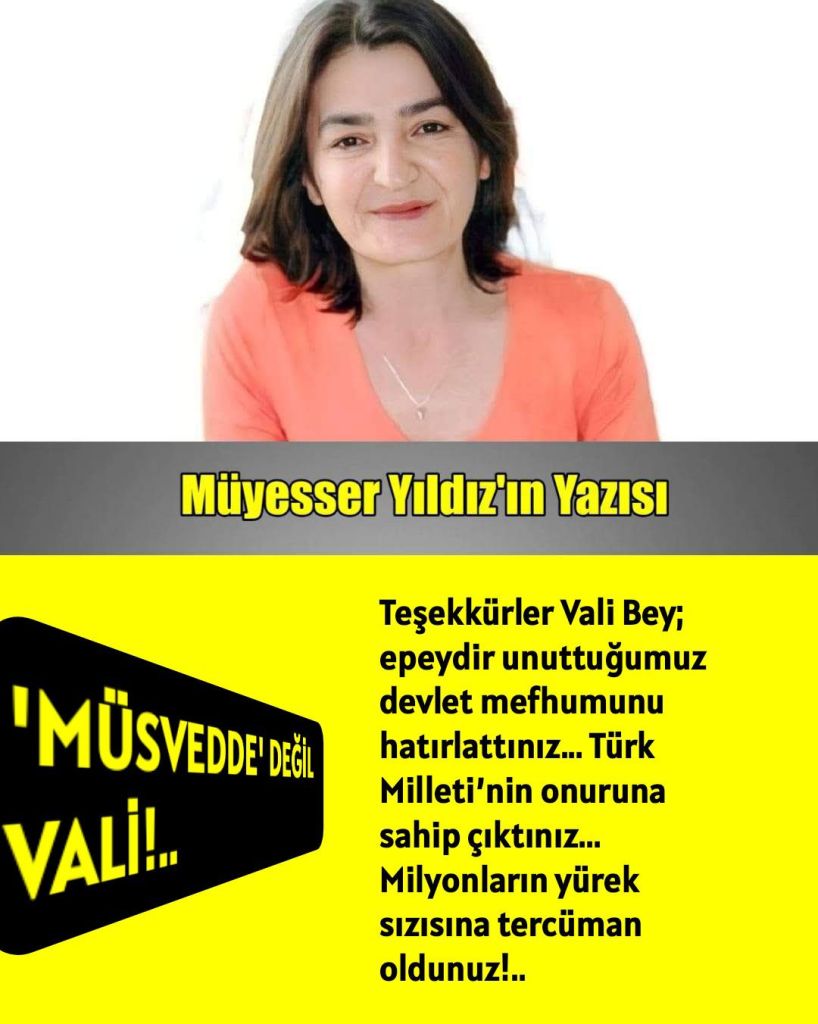 Teşekkürler Vali Bey; epeydir unuttuğumuz devlet mefhumunu hatırlattınız… Türk Milleti’nin onuruna sahip çıktınız… Milyonların yürek sızısına tercüman oldunuz!..