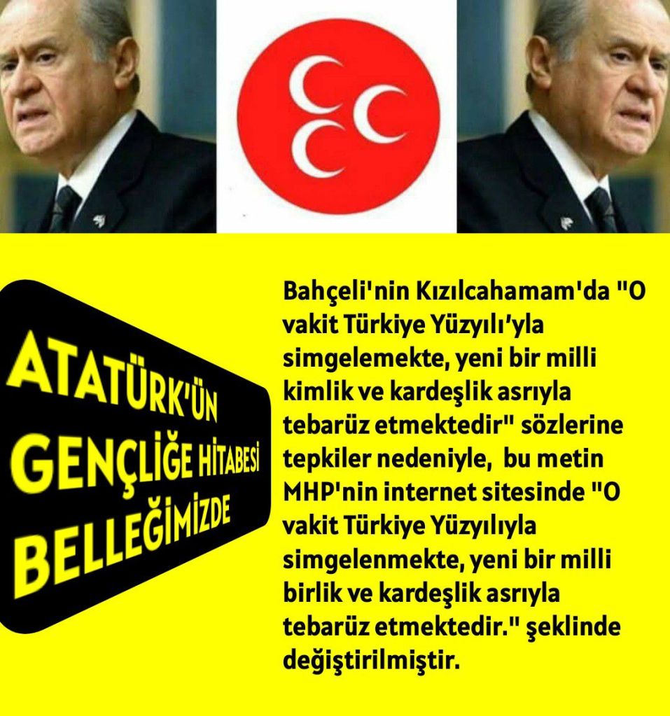 Bahçeli’nin Kızılcahamam’da “O vakit Türkiye Yüzyılı’yla simgelemekte, yeni bir milli kimlik ve kardeşlik asrıyla tebarüz etmektedir” sözlerine tepkiler nedeniyle, bu metin MHP’nin internet sitesinde “O vakit Türkiye Yüzyılıyla simgelenmekte, yeni bir milli birlik ve kardeşlik asrıyla tebarüz etmektedir.” şeklinde değiştirilmiştir.
