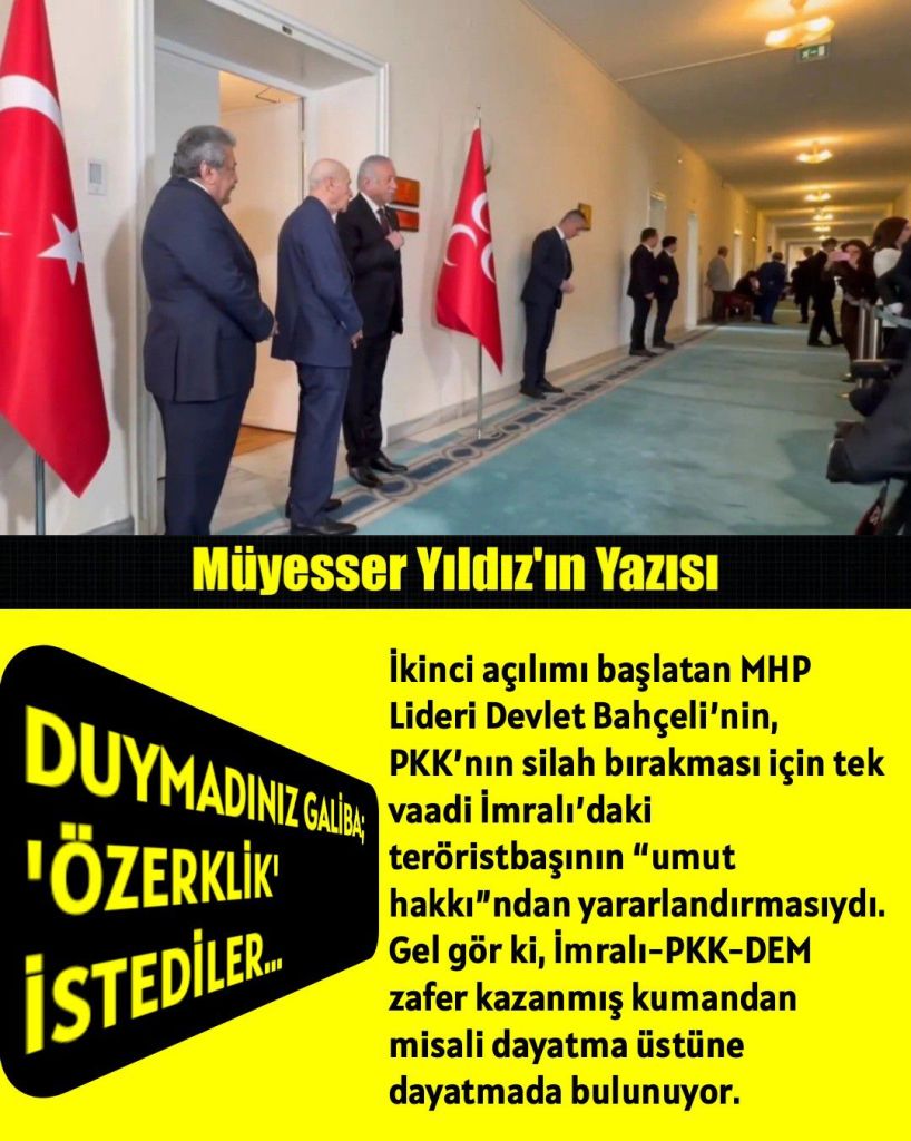 İkinci açılımı başlatan MHP Lideri Devlet Bahçeli’nin, PKK’nın silah bırakması için tek vaadi İmralı’daki teröristbaşının “umut hakkı”ndan yararlandırmasıydı. Gel gör ki, İmralı-PKK-DEM zafer kazanmış kumandan misali dayatma üstüne dayatmada bulunuyor.