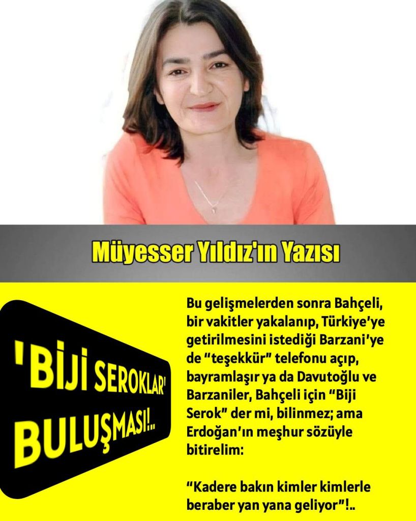 Bu gelişmelerden sonra Bahçeli, bir vakitler yakalanıp, Türkiye’ye getirilmesini istediği Barzani’ye de “teşekkür” telefonu açıp, bayramlaşır ya da Davutoğlu ve Barzaniler, Bahçeli için “Biji Serok” der mi, bilinmez; ama Erdoğan’ın meşhur sözüyle bitirelim: