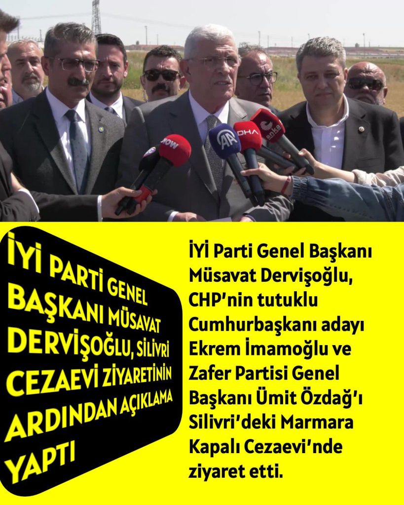 İYİ Parti Genel Başkanı Müsavat Dervişoğlu, CHP’nin tutuklu Cumhurbaşkanı adayı Ekrem İmamoğlu ve Zafer Partisi Genel Başkanı Ümit Özdağ’ı Silivri’deki Marmara Kapalı Cezaevi’nde ziyaret etti. Ziyaretinin ardından açıklama yapan Dervişoğlu, şunları söyledi: