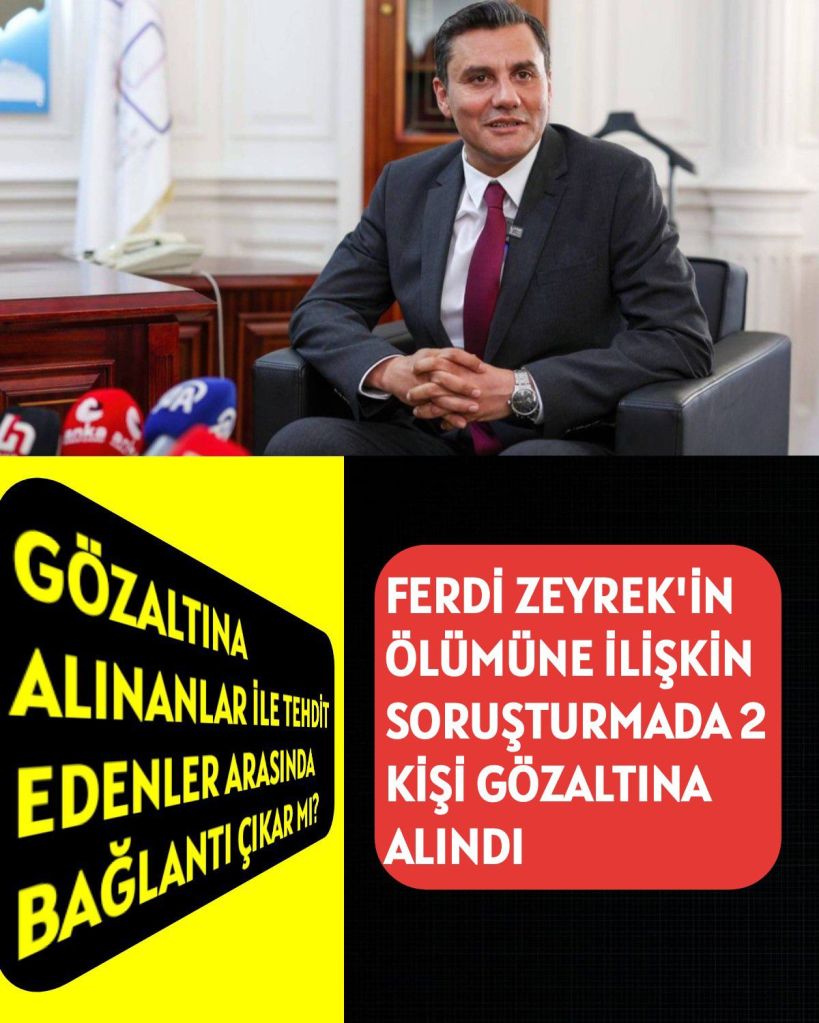 Manisa Büyükşehir Belediye Başkanı Ferdi Zeyrek’in evinde elektrik akımına kapılarak hayatını kaybetmesine ilişkin yürütülen soruşturma kapsamında 2 şüpheli gözaltına alındı. İfadelerinin ardından gözaltına alınan kişilerin villadaki havuzun bakımıyla ilgilenen Yalçın Ö. ile site içerisinde bakım ve güvenlik işleri ile uğraşan Ahmet S. olduğu belirtildi.