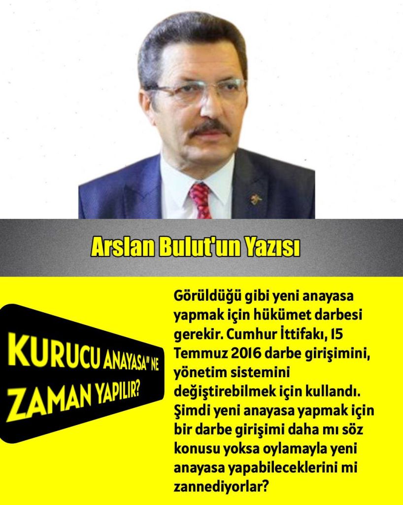 Görüldüğü gibi yeni anayasa yapmak için hükümet darbesi gerekir. Cumhur İttifakı, 15 Temmuz 2016 darbe girişimini, yönetim sistemini değiştirebilmek için kullandı. Şimdi yeni anayasa yapmak için bir darbe girişimi daha mı söz konusu yoksa oylamayla yeni anayasa yapabileceklerini mi zannediyorlar?