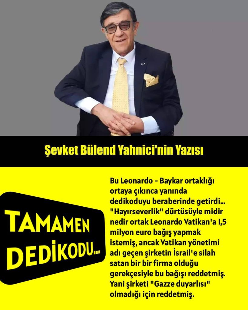 “Hayırseverlik” dürtüsüyle midir nedir ortak Leonardo Vatikan’a 1,5 milyon euro bağış yapmak istemiş, ancak Vatikan yönetimi adı geçen şirketin İsrail’e silah satan bir bir firma olduğu gerekçesiyle bu bağışı reddetmiş. Yani şirketi “Gazze duyarlısı” olmadığı için reddetmiş. Bakalım bizim “Gazze duyarlılığı” fevkalade yüksek yöneticisi cumhurcular ne diyecekler bu işe ?..