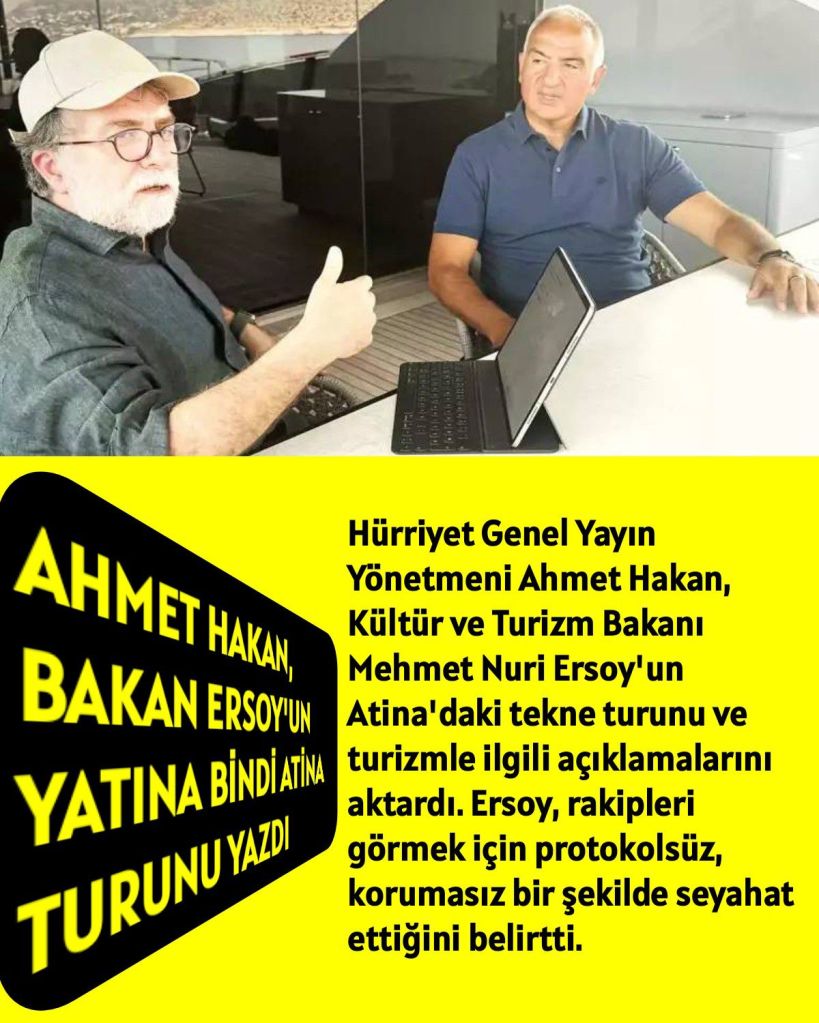 Ersoy’un Atina’daki 7 saatlik turuna dair Hakan şunları yazdı: “Bakan Ersoy’un durumu şuydu: Gerçekten de koruma yoktu, protokol yoktu, Yunan makamlarına bile haber vermemişti. Ersoy’un teknesi Pire Limanı’nda demirliydi. Teknede konuştum Bakan Ersoy’la. Önce turizmdeki son rakamları sordum.”