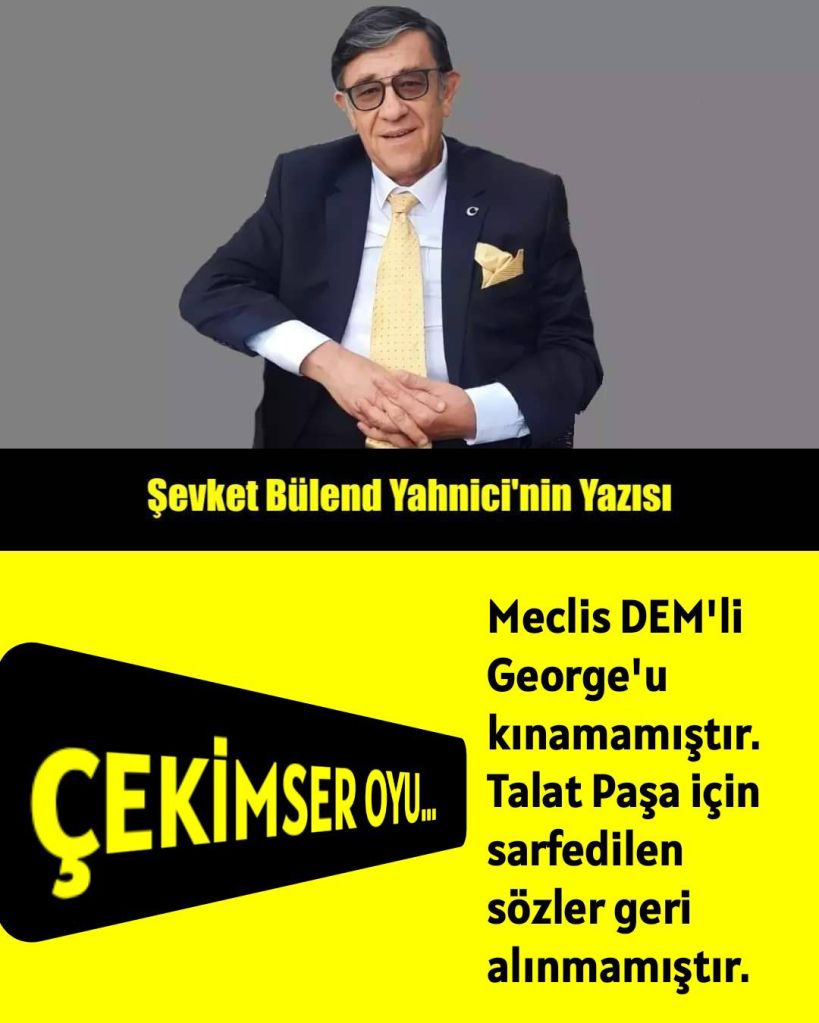 Bundan sonrası nedir ve nasıldır?.. Meclis DEM’li George’u kınamamıştır. Talat Paşa için sarfedilen sözler geri alınmamıştır. 33 ülke parlamentosundan sonra Türk parlamentosu da “sözde soykırım yalan ve iftirası imasi” karşısında sessiz kalmıştır;” Türk milleti soykirim yapmadi ” dememiştir; üstüne üstlük de bunların denmesi, söylenmesi için didinen bir arkadaşa kınama cezası vermiştir. MHP DE ” ÇEKİMSER” OY KULLANMIŞTIR… Dündar Taşer ” iyi ile kötü, hain ile kahraman, ilaç ile mikrop arasında tarafsız kalmak…” diyordu. George’la YASİN, Talat Paşa ile Tehliryan, ” soykırım yalanı” ile TÜRK MİLLETİ’NİN SOYKIRIM YAPMADIĞI GERÇEĞİ arasında “tarafsız” ya da “çekimser” kalmak mümkün müdür? Zaten herşey ANDIMIZ kaldırılırken de böyle başlamadı mı?..