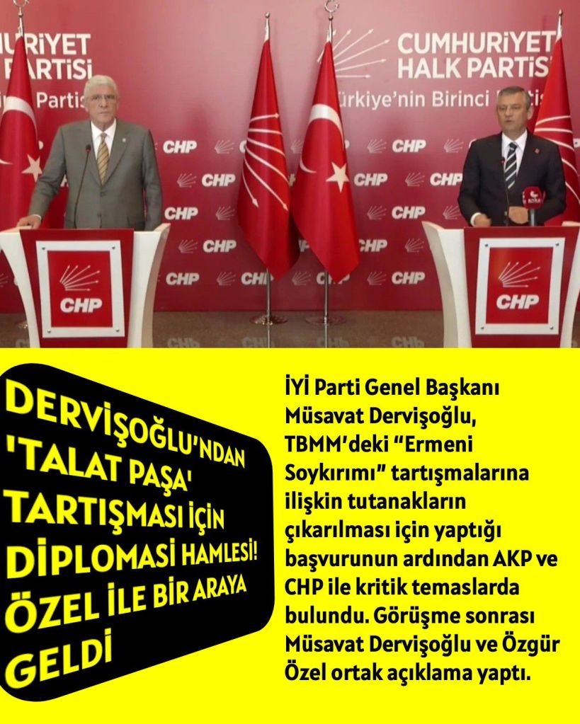 İYİ Parti Genel Başkanı Müsavat Dervişoğlu, TBMM’deki “Ermeni Soykırımı” tartışmalarına ilişkin tutanakların çıkarılması için yaptığı başvurunun ardından AKP ve CHP ile kritik temaslarda bulundu. Görüşme sonrası Müsavat Dervişoğlu ve Özgür Özel ortak açıklama yaptı.