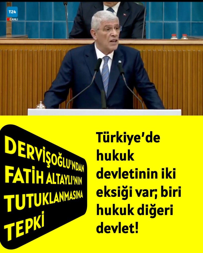 İyi Parti lideri Müsavat Dervişoğlu, partisinin TBMM’deki grup toplantısında gazeteci Fatih Altaylı’nın tutuklanmasına tepki göstererek; “Türkiye’de hukuk devletinin iki eksiği var; biri hukuk diğeri devlet. Son günlerde yaşadığımız bu durumun ikinci örneği hukuksuz tutuklamalardır. Onun da son temsilcisi Gazeteci Fatih Altaylı olmuştur” dedi. Kabul edilen maden yasasını da eleştiren Dervişoğlu, “Zeytin ağaçlarını taşıyacaklarmış. Nereye taşıyacaksınız? Beştepe’deki sarayın bahçesine mi?” ifadelerini kullandı.