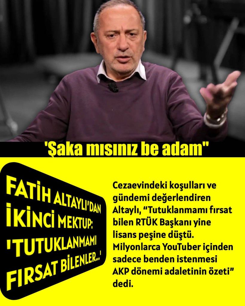 “Cumhurbaşkanına tehdit” suçlamasıyla tutuklanan gazeteci Fatih Altaylı’nın Silivri Cezaevi’nden yolladığı ikinci mektup yayımlandı. Cezaevindeki koşulları ve gündemi değerlendiren Altaylı, “Tutuklanmamı fırsat bilen RTÜK Başkanı yine lisans peşine düştü. Milyonlarca YouTuber içinden sadece benden istenmesi AKP dönemi adaletinin özeti” dedi.