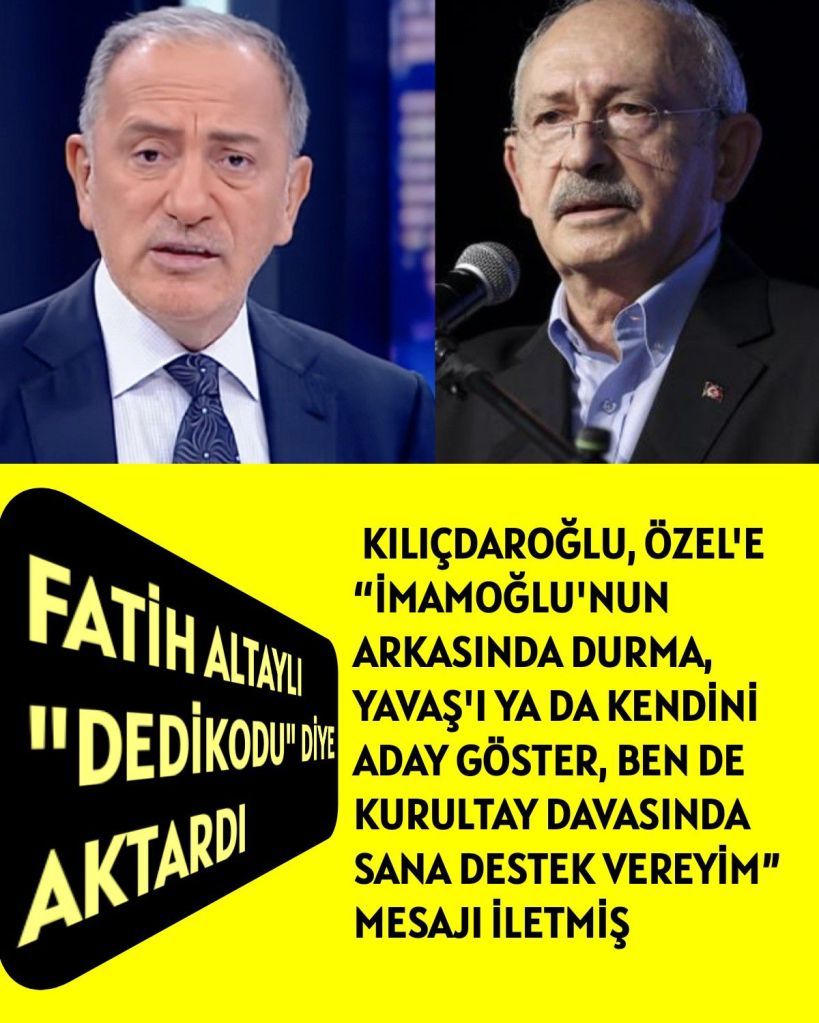 Altaylı öte yandan ikki kaynaktan kulağına gelen bir iddiayı de aktardığı mektubunda, “Duyduğum kadarıyla Kılıçdaroğlu, Özgür Özel’e ‘İmamoğlu’nun arkasında durma, cumhurbaşkanı olarak Mansur Yavaş’ı ya da kendini göstermeyi gündeme al, ben de o zaman kurultay davasında sana destek vereyim’ mesajı iletmiş. Bunu iki ayrı yerden duydum ama dediğim gibi dedikodu” diye yazdı.