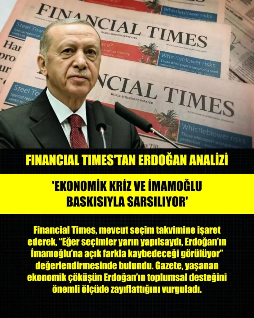 Financial Times, mevcut seçim takvimine işaret ederek, “Eğer seçimler yarın yapılsaydı, Erdoğan’ın İmamoğlu’na açık farkla kaybedeceği görülüyor” değerlendirmesinde bulundu. Gazete, yaşanan ekonomik çöküşün Erdoğan’ın toplumsal desteğini önemli ölçüde zayıflattığını vurguladı.
