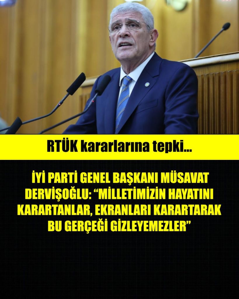 İYİ Parti Genel Başkanı Müsavat Dervişoğlu, RTÜK’ün ekran karartma ve para cezalarına ilişkin “Toplumsal sözleşmemiz olan Anayasamızı çiğnemeyi alışkanlık haline getiren iktidar, RTÜK aracılığı ile bir kez daha bu yüzünü göstermiştir. Sözcü TV’den sonra bu kez de Halk TV’ye 10 gün ekran karartma cezası, yine Sözcü TV ve Tele 1’e de para cezası vermiştir. Hatırlatmak isterim ki, milletimizin hayatını karartanlar, ekranları karartarak bu gerçeği gizleyemezler. Türkiye bir süredir bir korku tünelinden geçiyor ve bu tünelin duvarları yalnızca karanlıkla değil, aynı zamanda demir parmaklıklarla örülüdür” dedi.