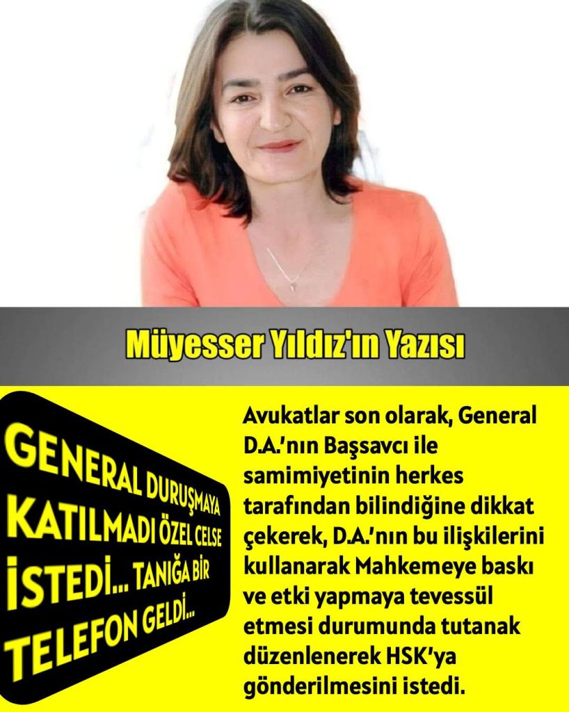 Avukatlar son olarak, General D.A.’nın Başsavcı ile samimiyetinin herkes tarafından bilindiğine dikkat çekerek, D.A.’nın bu ilişkilerini kullanarak Mahkemeye baskı ve etki yapmaya tevessül etmesi durumunda tutanak düzenlenerek HSK’ya gönderilmesini istedi.