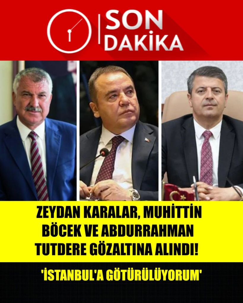 CHP’li Adana Büyükşehir Belediye Başkanı Zeydan Karalar ve Adıyaman Belediye Başkanı Abdurrahman Tutdere hakkında gözaltı kararı verildiği bildirildi. Sosyal medya hesabından açıklama yapan Tutdere, İstanbul’a götürüldüğünü açıkladı. Karalar ve Tutdere’nin yanı sıra, Antalya Büyükşehir Belediye Başkanı Muhittin Böcek’in de gözaltına alındığı kaydedildi.