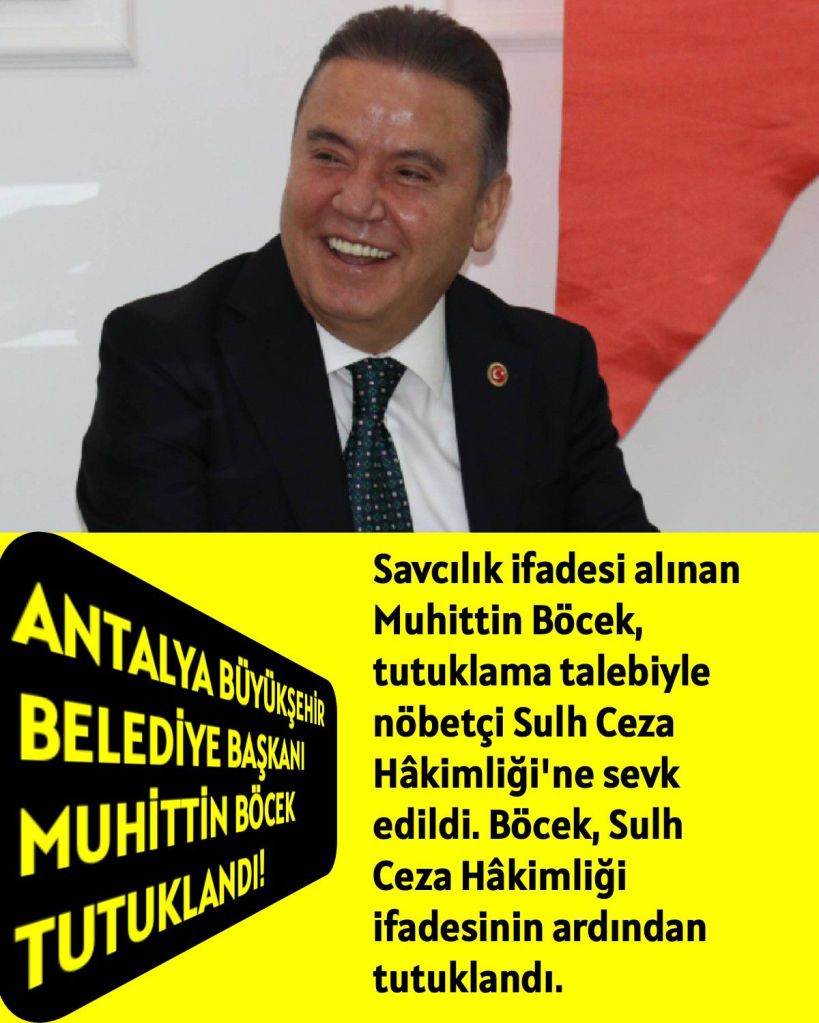 Antalya Büyükşehir Belediye Başkanı Muhittin Böcek de gözaltına alındı: Oğlu ve eski gelinine de gözaltı: https://t24.com.tr/haber/antalya-buyuksehir-belediye-baskani-muhittin-bocek-e-de-gozalti,1248209