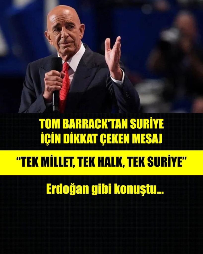 Açıklamalarının devamında, Cumhurbaşkanı Erdoğan’ın sıkça kullandığı “Tek millet, tek vatan, tek devlet, tek bayrak” sloganına benzer bir ifadeyle Suriye’de de birlik çağrısı yapan Barrack, şu ifadeleri kullandı: “Hepimizin aynı noktada buluşması önemli. Tek millet, tek halk, tek ordu, tek Suriye olmalı.” Bu mesajı, Suriye’deki farklı grupların uzlaşmaya varması gerekliliği olarak tanımladı.
