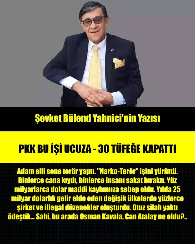 Adam elli sene terör yaptı. “Narko-Terör” işini yürüttü. Binlerce cana kıydı, binlerce insanı sakat bıraktı. Yüz milyarlarca dolar maddi kaybımıza sebep oldu. Yılda 25 milyar dolarlık gelir elde eden değişik ülkelerde yüzlerce şirket ve illegal düzenekler oluşturdu. Otuz silah yaktı ödeştik… Sahi, bu arada Osman Kavala, Can Atalay ne oldu?..
