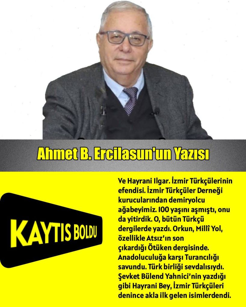 Ve Hayrani Ilgar. İzmir Türkçülerinin efendisi. İzmir Türkçüler Derneği kurucularından demiryolcu ağabeyimiz. 100 yaşını aşmıştı, onu da yitirdik. O, bütün Türkçü dergilerde yazdı. Orkun, Millî Yol, özellikle Atsız’ın son çıkardığı Ötüken dergisinde. Anadoluculuğa karşı Turancılığı savundu. Türk birliği sevdalısıydı. Şevket Bülend Yahnici’nin yazdığı gibi Hayrani Bey, İzmir Türkçüleri denince akla ilk gelen isimlerdendi.