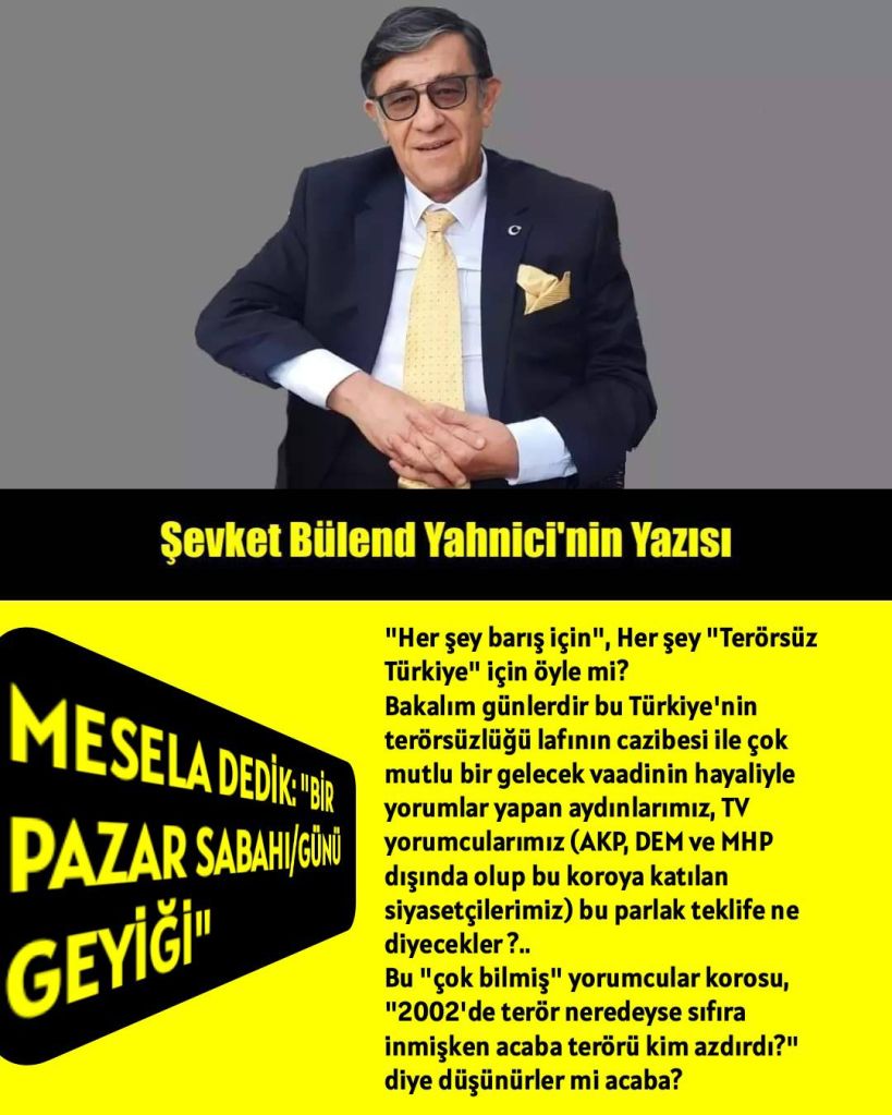 Bakalım günlerdir bu Türkiye’nin terörsüzlüğü lafının cazibesi ile çok mutlu bir gelecek vaadinin hayaliyle yorumlar yapan aydınlarımız, TV yorumcularımız (AKP, DEM ve MHP dışında olup bu koroya katılan siyasetçilerimiz) bu parlak teklife ne diyecekler ?..